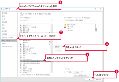 二つ目は、Alt→F→T(Alt→T→O、あるいは「ファイル」タグ→「オプション」)で「Excelのオプション」を開き、「クイックアクセスツールバー」を選択、追加したいコマンドを探して、「追加」、「OK」をクリックする方法です。