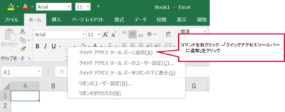 この方法は、マウスを使って直感的にできますので、作業の途中で「このコマンドをクイックアクセスツールバーに追加したい」と思ったときに、すぐ登録できるのが便利です。