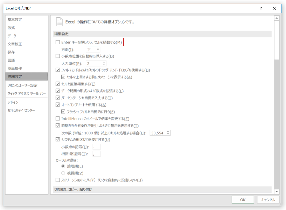 そこで、Enterキーを押してもアクティブセルが移動しないように設定を変更します。