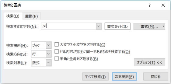 ③検索する文字列に「.xl」を入力し、「すべて検索」あるいは「次を検索」をクリックする