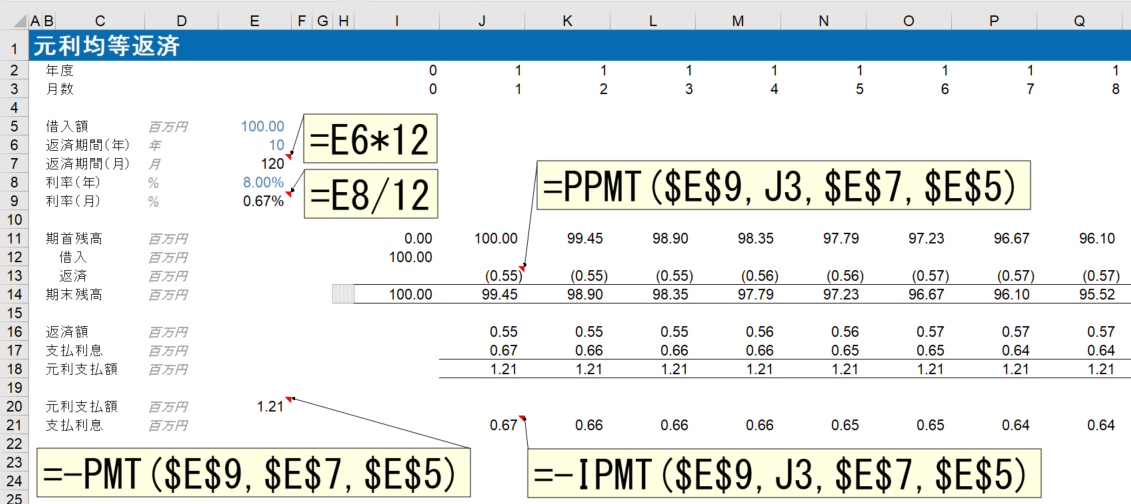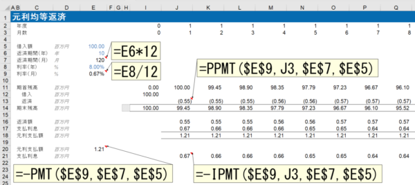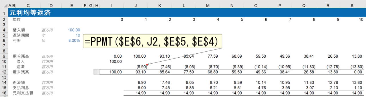 元金均等返済のモデルから、返済の部分だけPPMT関数を使って修正すると、元利均等返済のモデルが完成です。
