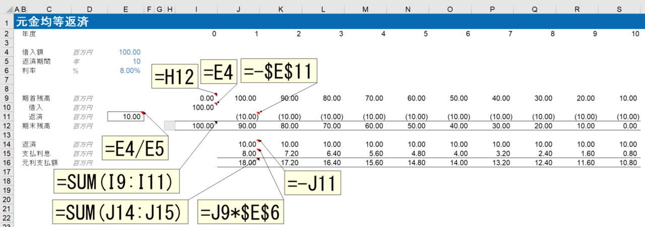 元金均等返済の場合は、元金の返済額が一定ですので、毎年の返済額は100百万円/10年で10百万円となります。