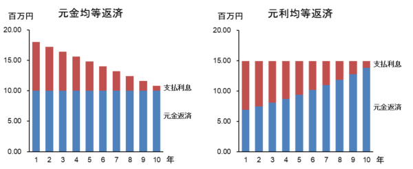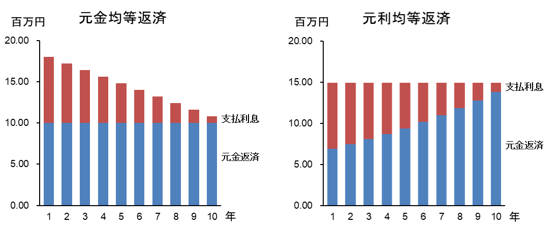 一つが元金の返済を同じ金額ずつしていく「元金均等返済」で、もう一つが元金返済と支払利息の合計が同じ金額となるように返済していく「元利均等返済」です。