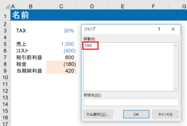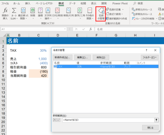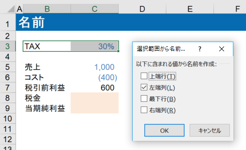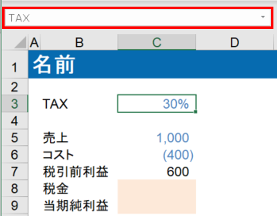 このブック内では、TAXと入力すれば、このC3セルの数字(30%)を入力しているのと同じになります。