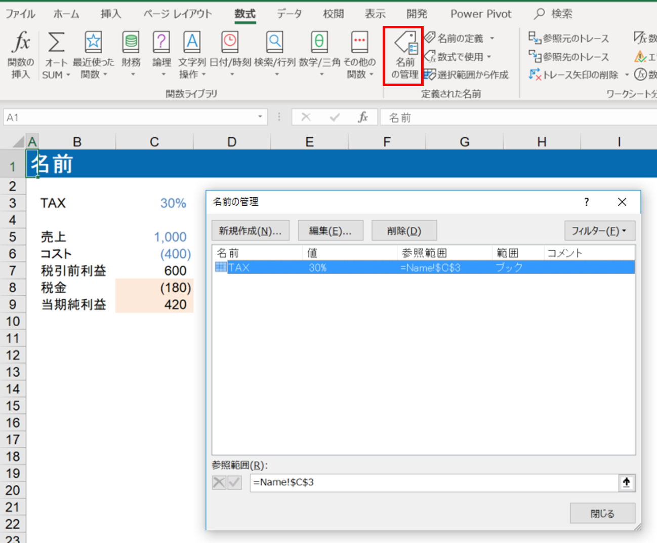 名前を確認するには、Ctrl+F3、もしくは「数式」タブの「定義された名前」のところにある「名前の管理」をクリックすれば、付けた名前、値、参照範囲、範囲を確認・修正・削除をすることができます。