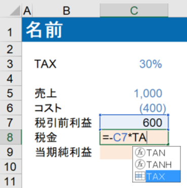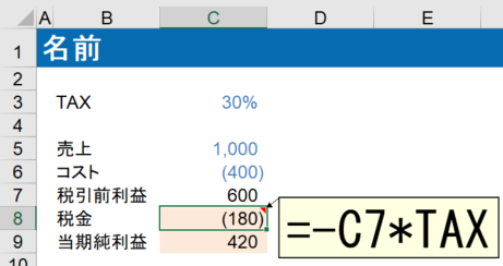 したがって、税引前利益から税金の金額を計算する際には、税引前利益(C7セル)に「TAX」を掛ければ、求めることができます。