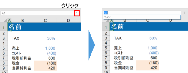 C3セルを選ぶと、左上にある「名前ボックス」に「TAX」と表示されます。