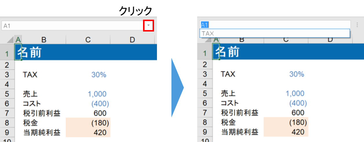 また、名前ボックスの右端にある▼をクリックすれば、名前のリストを見ることができ、その名前をクリックしても、名前を付けたセルに移動することができます。