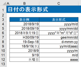 このように、日付を入力さえすれば、表示形式の設定の仕方で、年、月、日、曜日だけをセルに表示することができます。