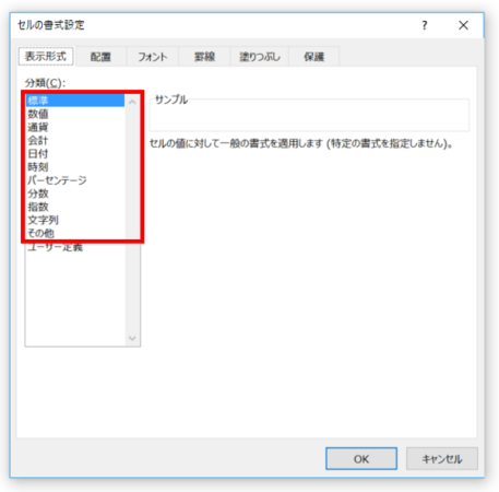 「表示形式」タブの「分類」の中に「数値」「通貨」・・・「その他」といったリストがありますので、これらを選択して設定することができます。