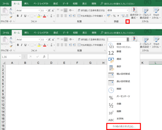 なお、「セルの書式設定」のダイアログボックスは、「ホーム」タブの「数値」の右下をクリックしても、「ホーム」タブの「数値」のところのリストにある「その他の表示形式」をクリックしても、表示できます。