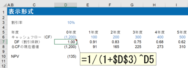 数値で入力し表示形式で設定すれば、あくまでもセルに入力するのは数値で、見た目だけ文字列のようになっているわけで、計算にも使うことができます。先ほどの例では、以下のようにキャッシュフローを現在価値に割引く際の割引係数を求める際に年度の数字を使っています。