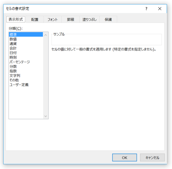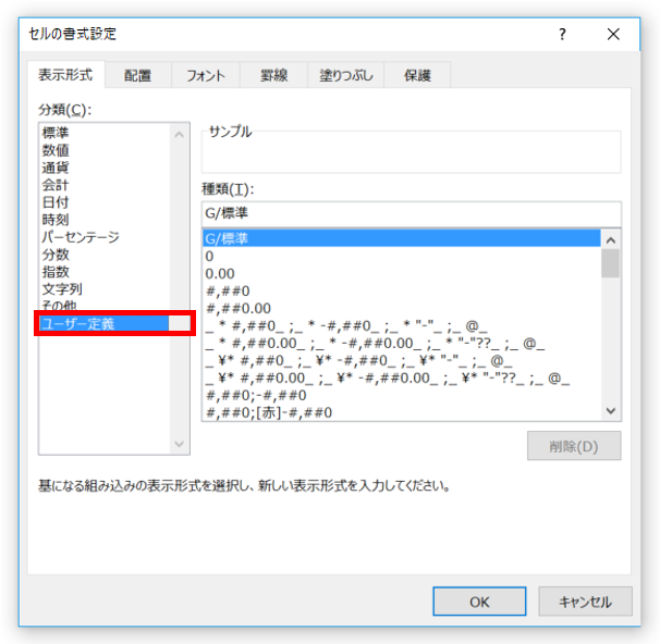 もし、これらの中にも思うような表示形式がない場合は、「ユーザー定義」で設定します。