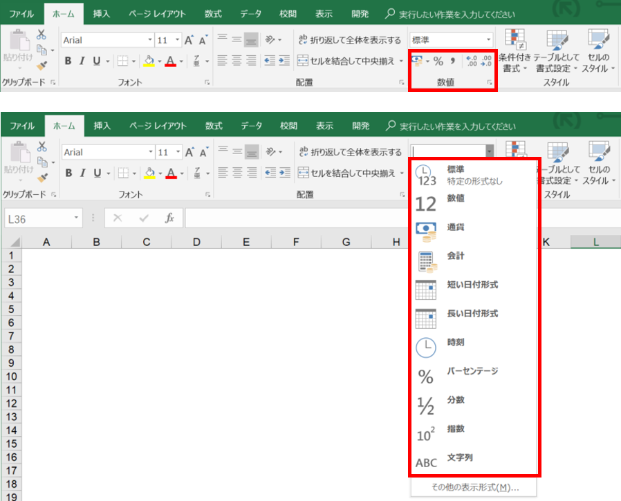 表示形式は、「ホーム」タブの「数値」のところにあるコマンドやリストで変更することができます。