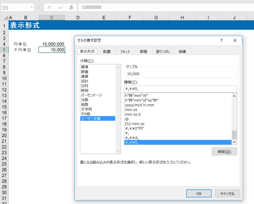 例えば、C4セルは#,##0の表示形式、C5セルは#,##0,の表示形式(C4セルの表示形式の後に”,(コンマ)”を付ける)と設定しています。