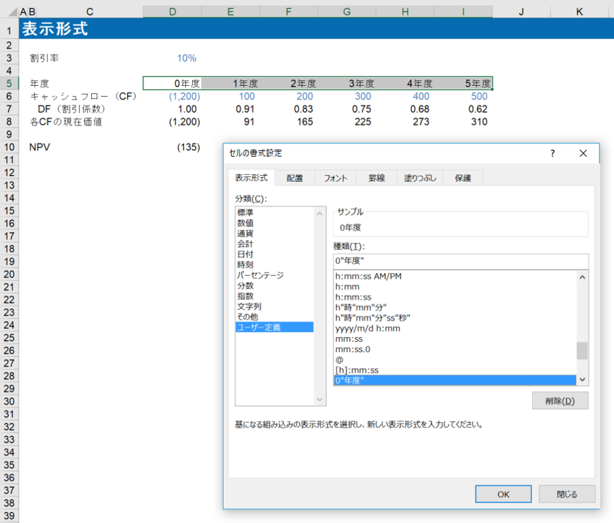 数値で入力し表示形式で設定すれば、あくまでもセルに入力するのは数値で、見た目だけ文字列のようになっているわけで、計算にも使うことができます。先ほどの例では、以下のようにキャッシュフローを現在価値に割引く際の割引係数を求める際に年度の数字を使っています。