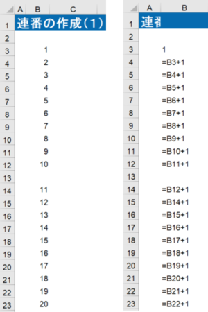 一つ目の方法や二つ目の方法は列方向に連番を作成する場合にも同様に作成できます。