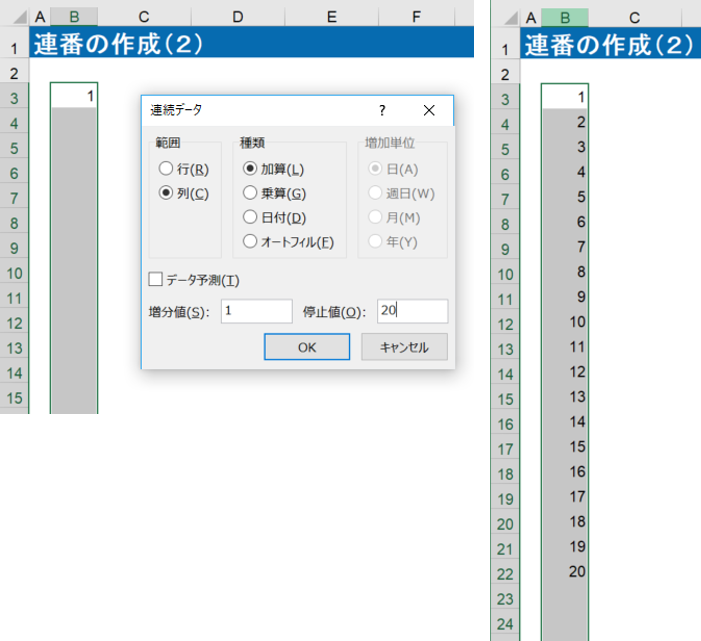 範囲が「列」で増分値が「1」になっていることを確認し、停止値を20に設定し、OKを押します。