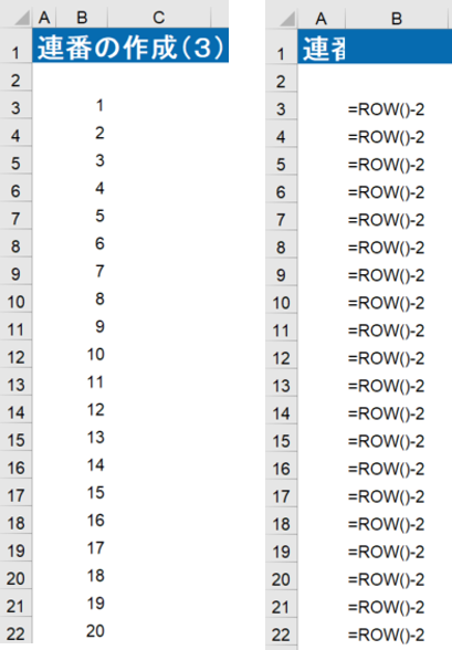 そこで、B3セルに=ROW()-2と入力し、それをコピーすれば、以下のように連番が作成できます。