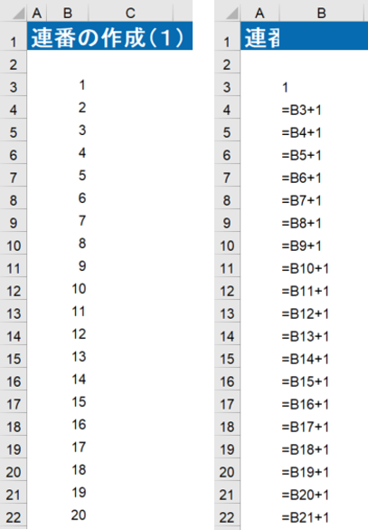 まず、一つ目の方法は、一番最初のセル(B3セル)に1を入力し、次のセル(B4セル)にはその値(B3セル)に1を加えるように式(=B3+1)を入力し、その数式をコピーするというものです。