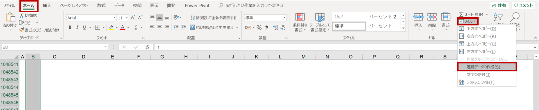 そして、今は列方向に連番を作成したいので、B3セルを選択した状態で、Shift+Ctrl+↓を押して、B3セルから下のセルを選択します(こうすることで連続データの作成の範囲が自動的に「列」に設定されます)。