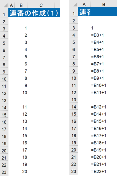 この場合も最初のセル(B3セル)には1を入力しておきます。