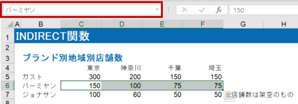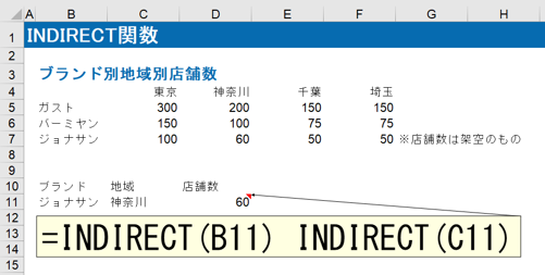 ここで、B11セルとC11セルに、それぞれブランド(ジョナサン)と地域(神奈川)を入力して、D11セルに=INDIRECT(B11) INDIRECT(C11)と入力すると、 ジョナサンと神奈川の共通部分にある60という数字が表示されます。