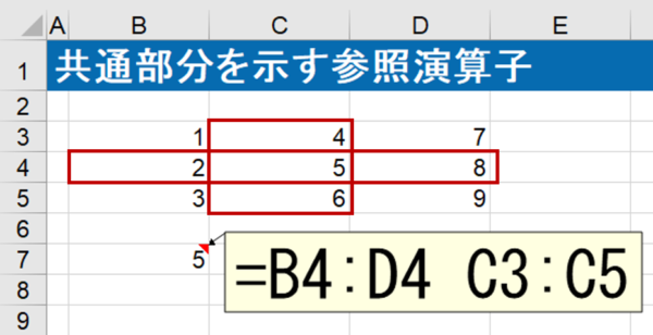 (半角スペース)はセル範囲の共通部分を示す参照演算子で、B4:D4のセル範囲とC3:C5のセル範囲の共通部分であるC4セルの5が表示されます。