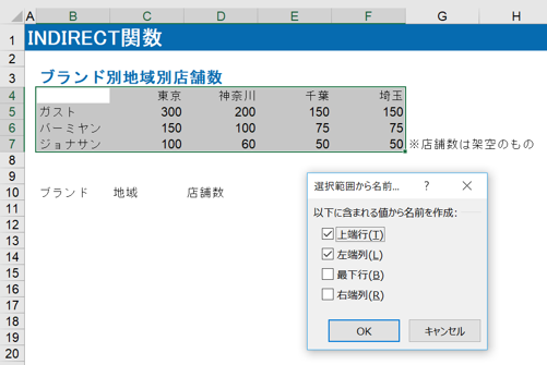 まずは、以下のようにB4:F7を選択して、Ctrl+Shift+F3を押すと、「上端行」「左端列」にチェックが入った状態のダイアログボックスが出てきますので、Enter を押します。