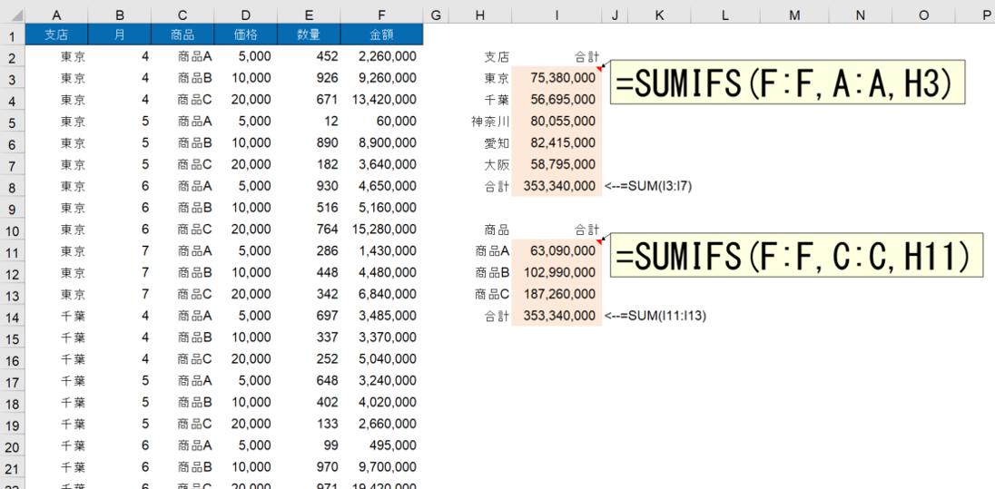 以下のように、支店や商品ごとの売上金額があった時に、支店ごとの売上金額、商品ごとの売上金額を計算する際にもSUMIFS関数は有効です。