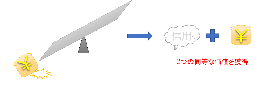 賢明な皆さんならば既知なことで敢えて説明するのも憚れますが、どんな時も必ず信用から先に獲りに行くという癖をつけることです。信用は目に見えないので、普通には獲ることはできません。でも、イメージ図のシーソーに釣り合っている状態に限り、信用を獲ることが可能です。信用は、金の反対側の板のどこかに必ずあるはずだからです。