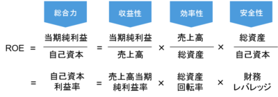 ROEとは、収益性と効率性と安全性の掛け算だということです。言い換えれば、収益性を高め、お金の回転を早くし、自己資本の割合を少なくする、つまり、有利子負債を使って財務レバレッジを高めることによって、ROEを高めることができるのです。