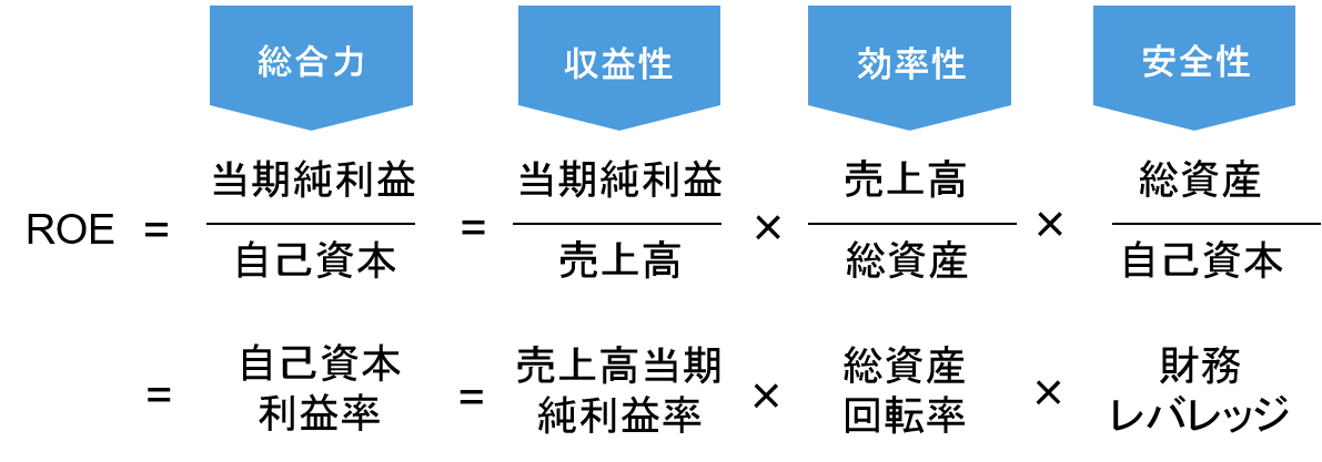 ROEとは、収益性と効率性と安全性の掛け算だということです。言い換えれば、収益性を高め、お金の回転を早くし、自己資本の割合を少なくする、つまり、有利子負債を使って財務レバレッジを高めることによって、ROEを高めることができるのです。