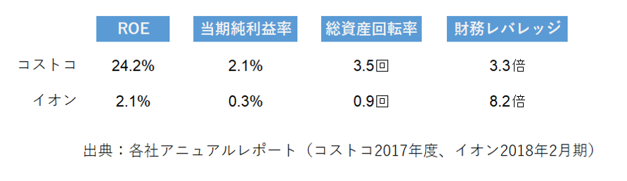 コストコの効率性(総資産回転率)の高さの結果として、ROEは24.2%に達していることがわかります。それに対して、イオンは当期純利益率0.3%と収益性の低いことに加え、総資産回転率が0.9回となっています。