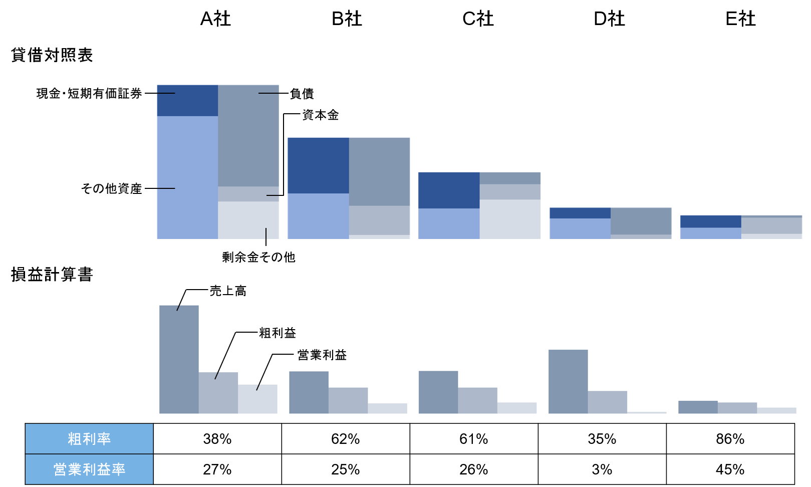 まずはBSをみてみましょうか。A社の BSの大きさが目をひきます。また、B社とC社、E社の現金・短期有価証券が資産の半分を占めることがわかります。つまり、キャッシュリッチな会社といえます。E社はまた、有利子負債はなく、無借金会社といえるかも知れません。無借金かつキャッシュリッチな会社はこの5つの企業ではどこなのでしょうか。