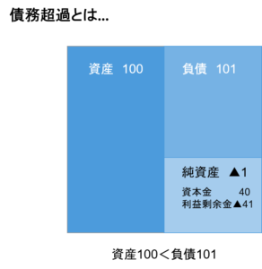 債務超過とは、バランスシートの資産を現金化しても負債を返済することが出来ない状況をさします。言い換えれば、下図の通り、純資産がマイナスの状況であるということです。