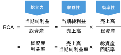 ここでROAを復習してみましょう。ROA(=Return on Asset)は当期純利益を総資産で割って算出します。言ってみれば、資産をどれだけ効率的に利益に結びつけることが出来たかを表す指標です。また、ROAは、以下のように売上高当期純利益率と総資産回転率の掛け算で表現できます。