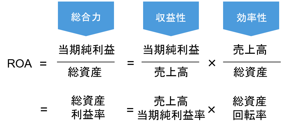 ここでROAを復習してみましょう。ROA(=Return on Asset)は当期純利益を総資産で割って算出します。言ってみれば、資産をどれだけ効率的に利益に結びつけることが出来たかを表す指標です。また、ROAは、以下のように売上高当期純利益率と総資産回転率の掛け算で表現できます。