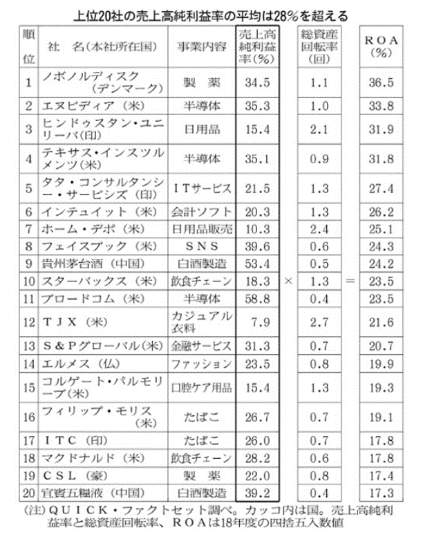 日経新聞(2019/6/7付)が時価総額5兆円以上の世界の上場企業を総資産利益率(ROA)で順位付けしました。米国企業が上位20社中12社を占めており、あらためて米国企業の経営効率の高さを見せつけられます。