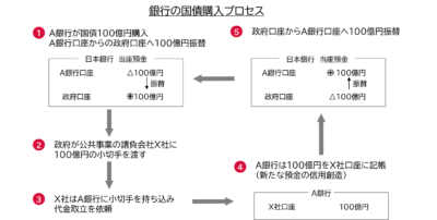 ⑥ 銀行は戻ってきた100億円で再び、国債を購入できます。(①に戻る)