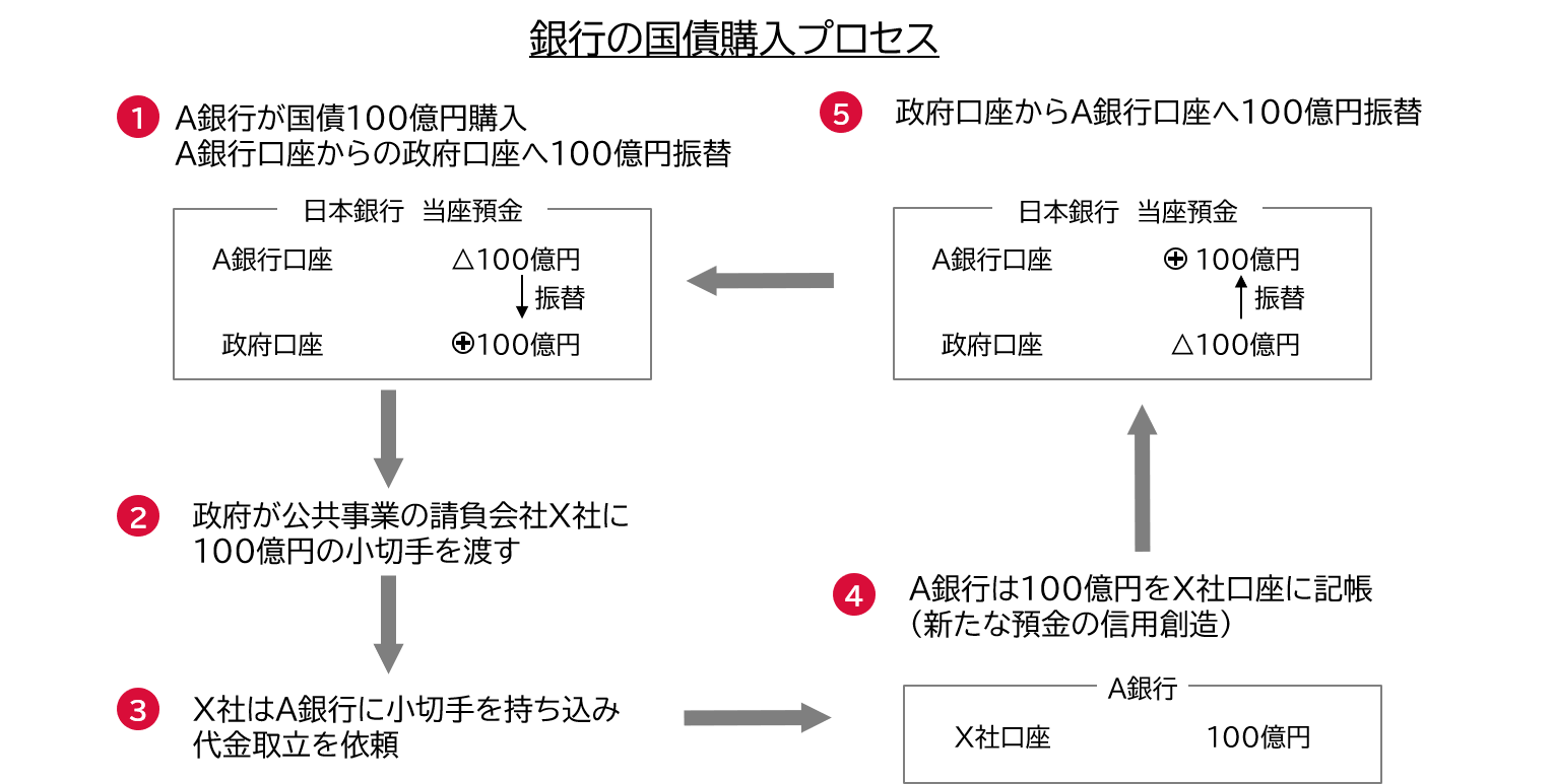 ⑥ 銀行は戻ってきた100億円で再び、国債を購入できます。(①に戻る)