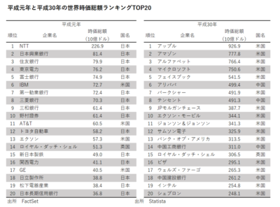 あらためて、平成元年の世界時価総額ランキングのTOP20(以下の図参照)を眺めてみると15社が日本企業ですから、その凄さがわかるというものです。当時は東京23区でアメリカが買えるとまで言われていたのです。
