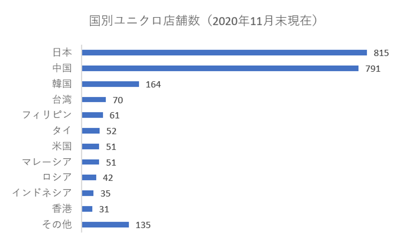 コロナ禍で世界的に在宅勤務が広がるにつれファーストリが強みとする普段着の需要が高まり、昨年2020年の夏以降に株価は急上昇していました。ZARAを時価総額で超えた理由の一つにその店舗が展開する地域の違いがあります。主力のユニクロは2,298店舗(2020年11月末)のうち、新型コロナ禍から早期に回復した中国は791店舗と日本につぐ規模になっています。