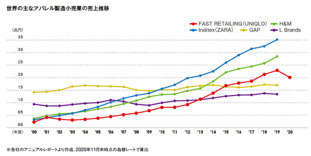 時価総額では世界一になったファーストリですが、売上規模や収益性という面ではまだ世界一とは言えない状況です。直近決算の売上高では、インディテックス(2020年1月期)は282億ユーロ(約3兆5000億円)。スウェーデンのH&Mの売上高(2020年11月期)は、1870億クローネ(約2兆3000億円)。ファーストリの2020年8月期売上高は約2兆円と世界3位となっています。それぞれの決算タイミングが異なるものの、インディテックスの規模の大きさは、いまだにファーストリを凌駕しています。