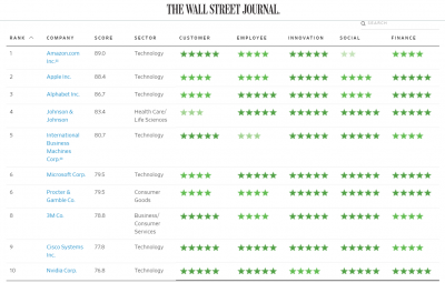 2017年12月8日付けのウォールストリートジャーナル(WSJ)によれば、ドラッカー研究所が市場シェア、特許申請件数、キャリア情報サイトでの従業員の評価など37の基準をもとにスコアを算出。2016年秋時点でS&P 500種株価指数の構成銘柄、フォーチュン500社、時価総額100億ドル以上のいずれかに該当した米企業608社のうち上位250社をリストアップしました。