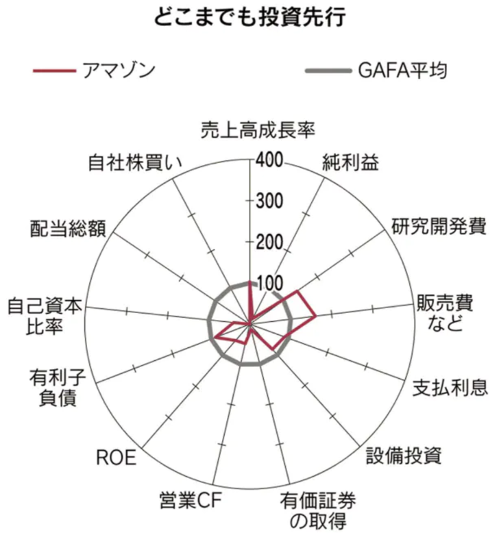 株主還元を進めるアップルに対し、創業以来22年間配当を支払ったことがないのがアマゾンです。いまだに未来投資をし続けています。まさに成長ステージにあるような資金配分をしているのがアマゾンです。レーダーチャートでは研究開発費と販売費がGAFA平均を上回っています。物流施設や配送を自社で担うアマゾンは他の3社と比較して、人件費などのコストがかかると言われています。研究開発費は18年12月期に約3兆2000億円と世界首位です。これは我が国首位のトヨタ自動車の3倍の規模です。