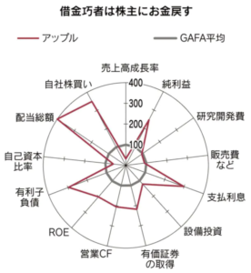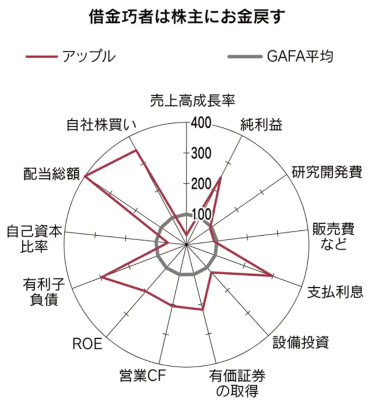 さらに自己資本比率は低いというのは、負債の割合が多いことを意味します。実際、有利子負債の金額と支払利息がGAFA平均の3倍になっています。そして、配当総額と自社株買いが突出しています。本業から得られた営業キャッシュフローと社債発行で得たキャッシュを配当や自社株買いなどの株主還元につなげていることがわかります。有利子負債を増やし、自社株買いによってデットとエクイティの比率を変化させ、資本コストを下げていく。まさにファイナンスのお手本のような財務政策をとっていることがわかります。