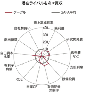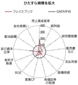 2019年12月4日付日経新聞「アップルは借金上手」に掲載されたGAFAのレーダーチャートは各社の成長ステージや戦略の違いがよく理解できるとても興味深いものでした。