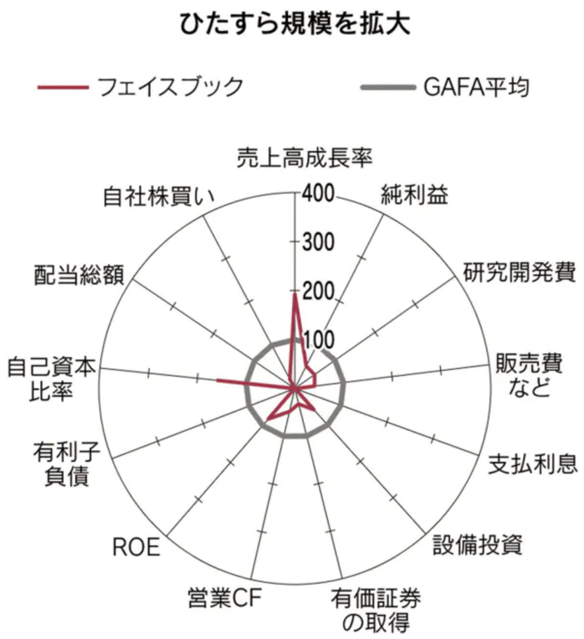 GAFAとひとくくりにして議論しがちですが、こうしてみると各社各様であることがよく分かります。やはり、定性的な部分だけでなく、定量的な分析をすることの大切さをこのレーダーチャートから再認識しました。