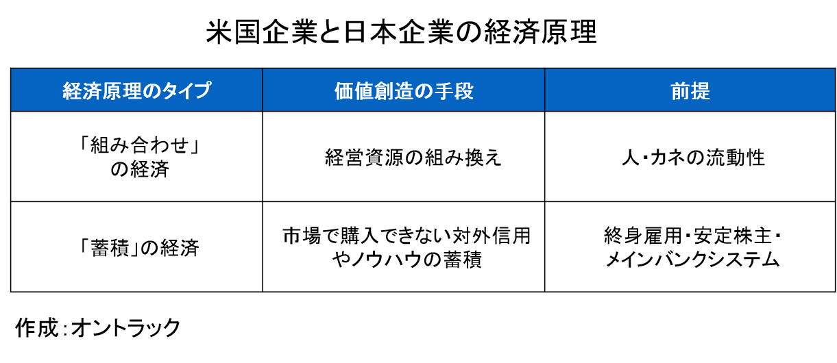 それと対極をなすのが日本企業を日本企業たらしめる経済原理である「蓄積」の経済。これは市場では買うことが出来ない対外信用やノウハウを長年にわたって蓄積すると、それが競争優位の源泉になるという考え方。その前提として人やカネの安定性、すなわち長期雇用や安定的株主が欠かせないわけです。